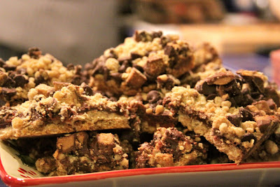 Combine the remaining chocolate chips, chopped peanut butter cups, and the reserved crumb topping. Sprinkle evenly over filling.